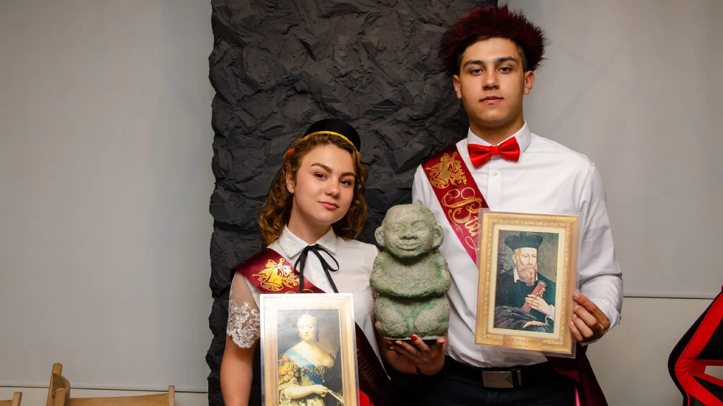 Квест на выпускной «Ночь в музее»: «А это точно твой дедушка?» Выпускники хвастаются портретами великих правителей, пытаясь повторить их выражения лиц, чтобы быть более похожими на «родственников».