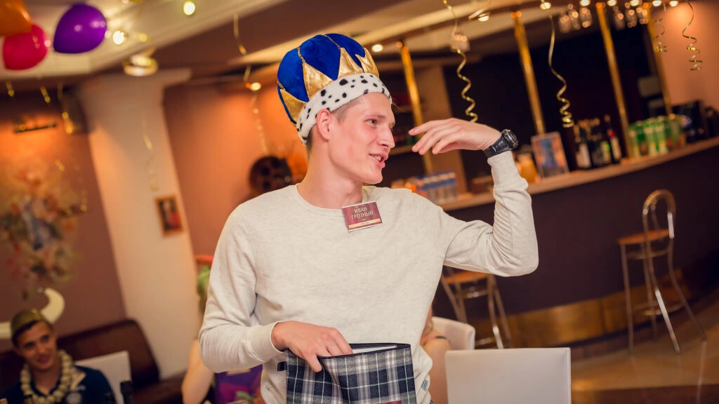 Квест на выпускной «Ночь в музее»: Иван Грозный царской рукой дарит милость, вручая всем своим оппонентам по фруктовому пирогу, что вызывает смешанные чувства от благодарных и испуганных гостей.